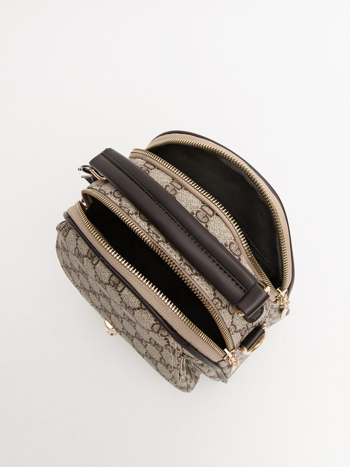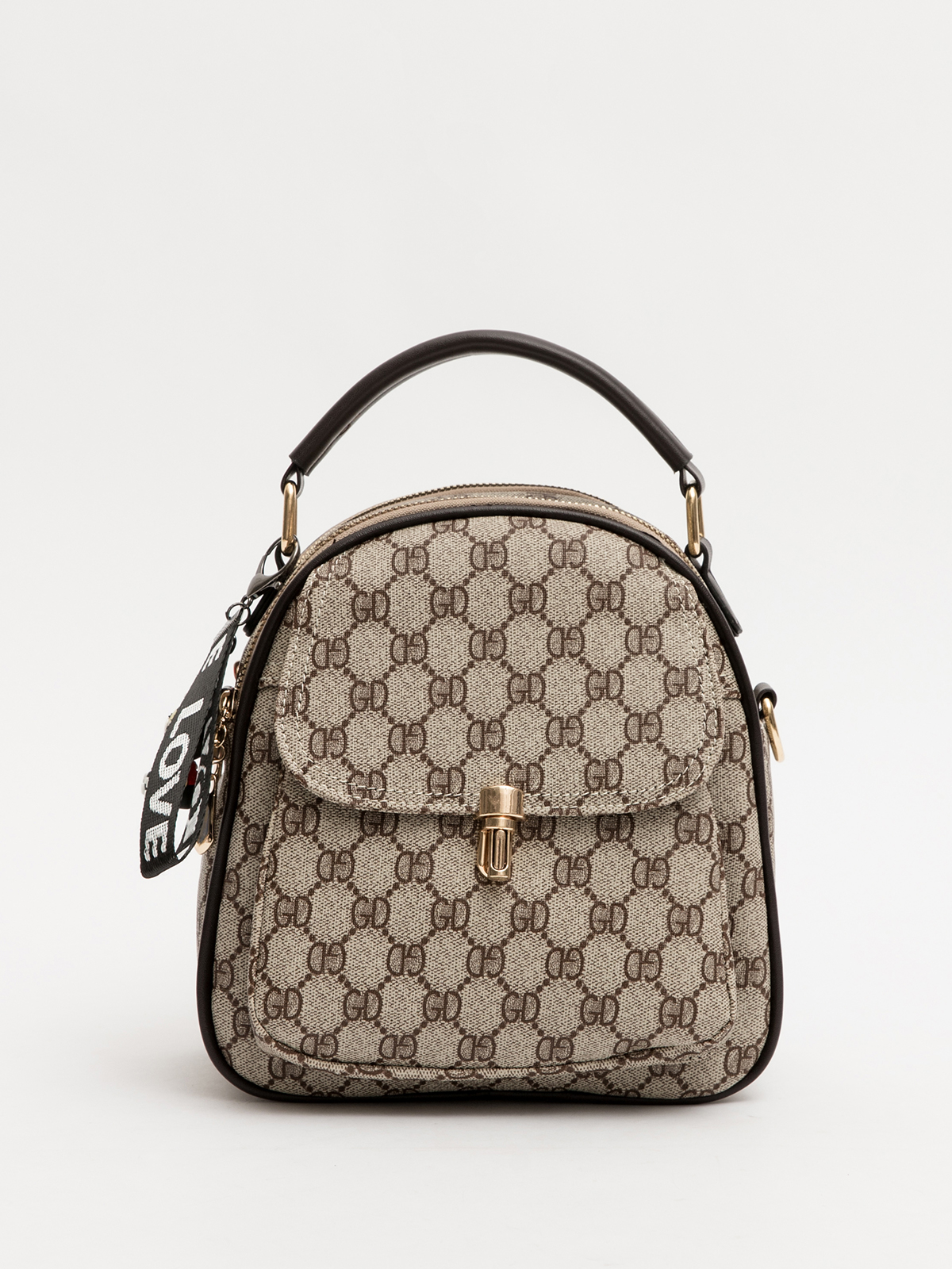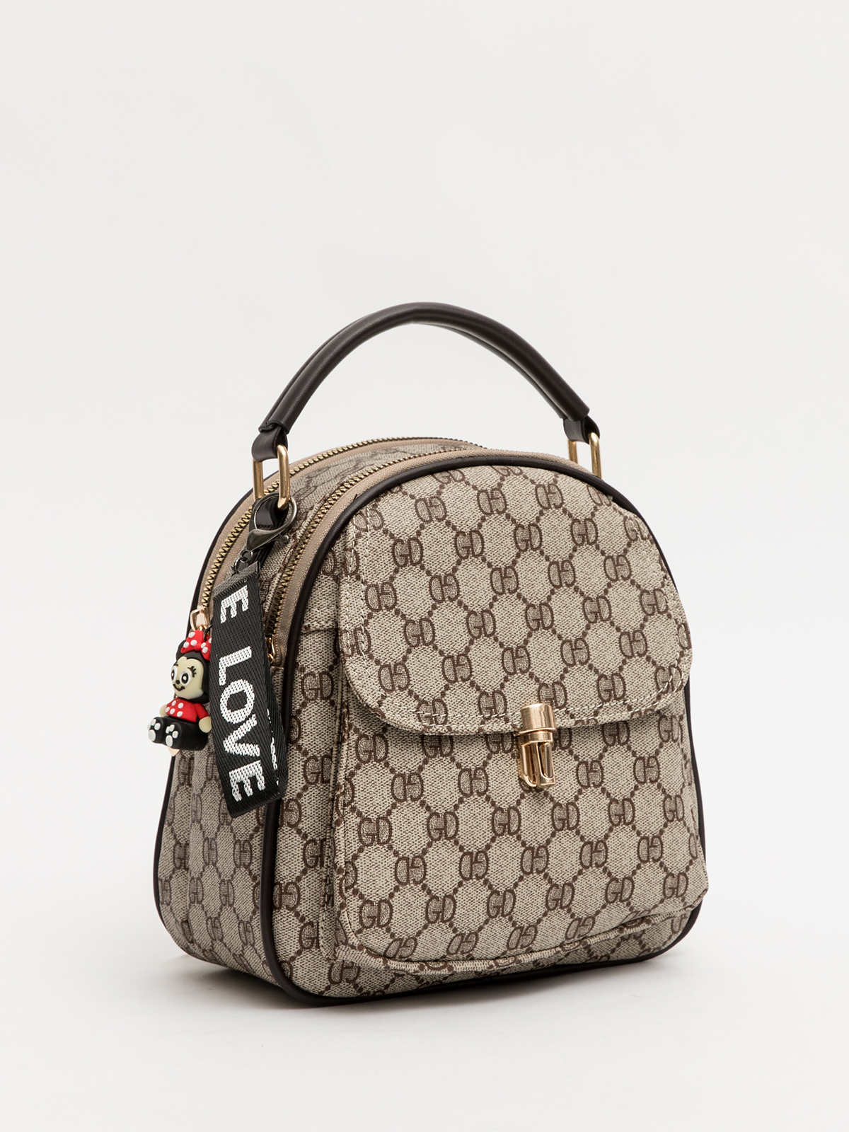 Сумка рюкзак из винилискожи габарита S имеет 2 отдела на молнии , два наружных кармана (один закрывается на молнию, второй - на клапан с замком), один внутренний карман на молнии и один внутренний открытый карман . Сумку можно ность как рюкзак и как кросс-боди.